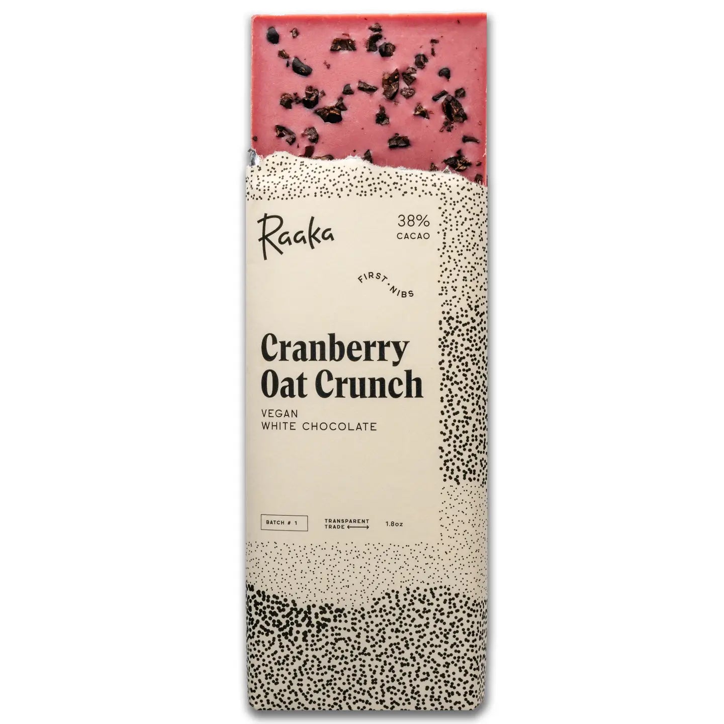 PUNCHY & CRUNCHY Cranberry's bright zing sings in a base of oat and toasted coconut white chocolate. Sprinkled nibs add a perfect crunch. Refined sugar free! This product is a limited edition run -- these are one-time small batch runs where we explore and experiment with all sorts of flavors and ingredients --we only make these flavors once and have a very limited quantity to share with the world. So once its gone, its gone!