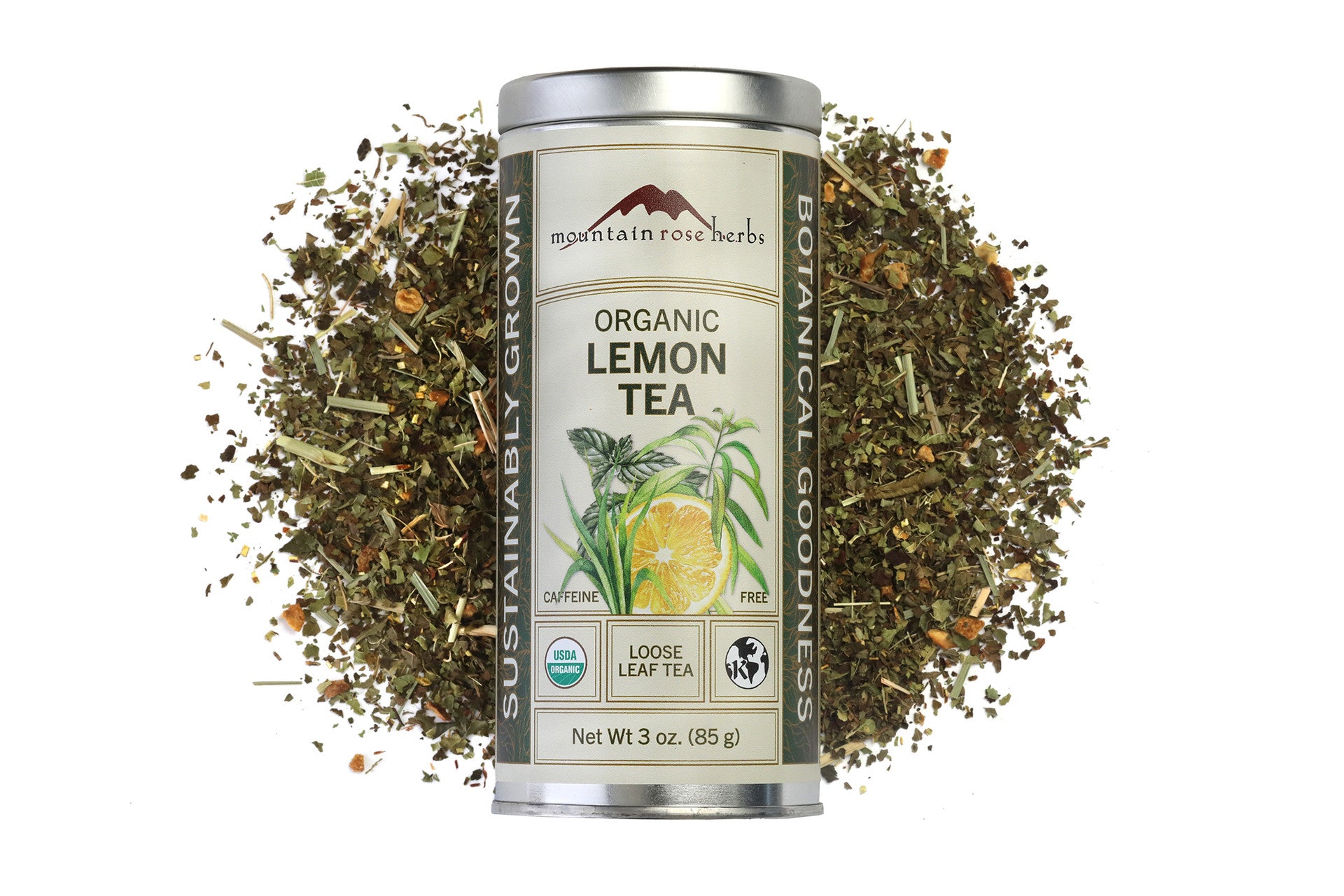 Organic lemon verbena, organic green rooibos tea, organic lemon balm, organic lemongrass, organic diced lemons, organic rosehips, and organic lemon flavoring.