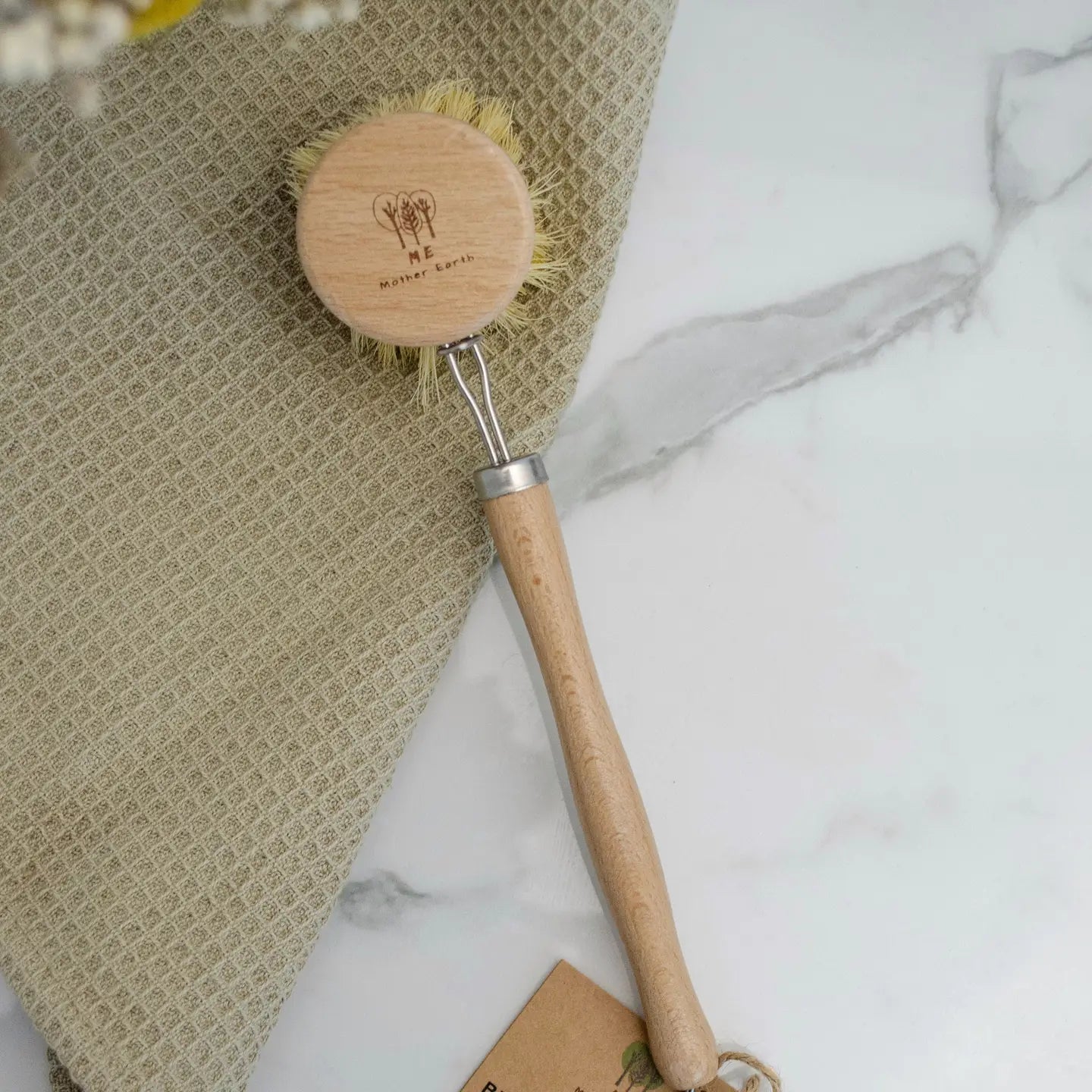 14 in stockSwap plastic dish brushes in the kitchen with our 100% biodegradable beechwood and sisal fiber dish brush. The head is removable and replaceable. Our kitchen brush has a beechwood handle with sisal fiber (agave plant) bristles. Minimally fastened together with a metal wire & metal loop to hang to dry. Size: Brush with handle is 9" Hang to dry in between uses, on a dry towel or elevated to allow bristles to drain. Heads last about 6 months, and handles last a couple of years. Packaging: kraft paper tag with care instructions and UPC.