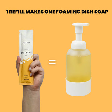 Low stock: 6 leftSay Goodbye to Single-Use Plastic Dish Soap Bottles With our concentrated powder refills, cleaning your dishes effectively without harsh chemicals and plastic waste is easier than ever. Join the movement towards sustainable living with our eco-friendly dish soap refills. * 🌱 Safer Ingredients: Made with planet and human-friendly ingredients. * 💪 Effective on Grease: 3rd party tested to perform better than a leading big brand. * 🐰 Certified Cruelty-Free. Key Features: * ECO-FRIENDLY: No more plastic waste, just sustainable cleaning. * EASY TO REFILL: Each refill makes 12oz of foaming dish soap, compatible with Elcove glass bottles or any 12oz foaming dispenser. * GENTLE ON HANDS: powerful yet gentle dish soap leaves hands soft. * WOMAN-OWNED: Manufactured in the USA by a small, woman-owned business.